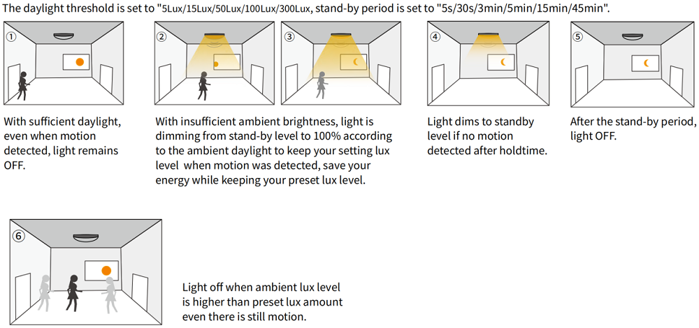 Datorită tehnologiei dual-PD, senzorul MC004-S02R poate face diferența dintre lumina naturală și cea artificială LED. Senzorul va aprinde corpurile de iluminat atunci când lumina ambientală este mai mică decât valoarea setată, chiar dacă nu este detectată nicio mișcare. Când lumina ambientală atinge valoarea setată, senzorul va stinge corpurile de iluminat chiar dacă există încă mișcare.