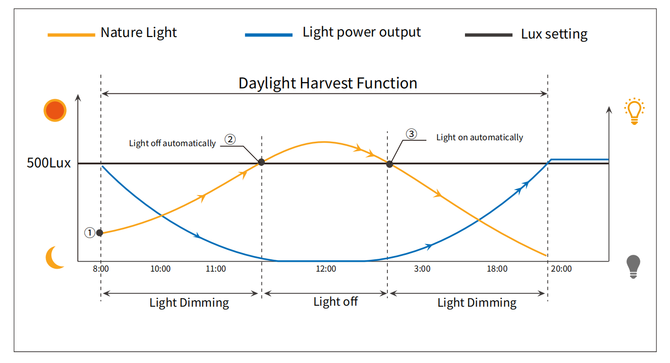 Recoltarea luminii de zi - Sesizează automat intensitatea luminii ambientale și ajustează dinamic luminozitatea lămpilor pentru a optimiza consumul de energie;