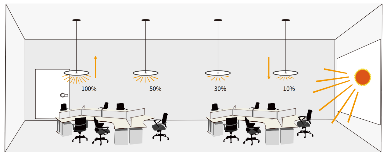 Când senzorul detectează lumina naturii, va diminua lumina, corpul de iluminat reduce ieșirea după cum urmează: